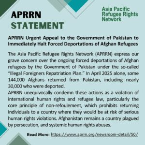 The Asia Pacific Refugee Rights Network (APRRN) express our grave concern over the ongoing forced deportations of Afghan refugees by the Government of Pakistan under the so-called “Illegal Foreigners Repatriation Plan.” In April 2025 alone, some 144,000 Afghans returned from Pakistan, including nearly 30,000 who were deported[1].